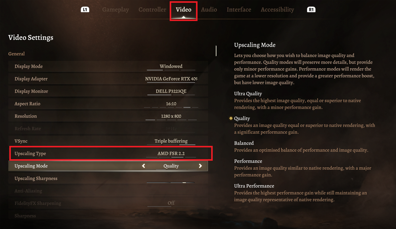 To do so, go into the game’s settings menu. Under the Video tab, scroll down until you find a setting called Upscaling Type. You can switch this over to FSR 2.2 for the best balance between performance and image sharpness.